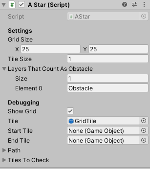 With these settings you can change the size of the grid and the size of the grid tiles. You can also change the layers that count a obstacles.